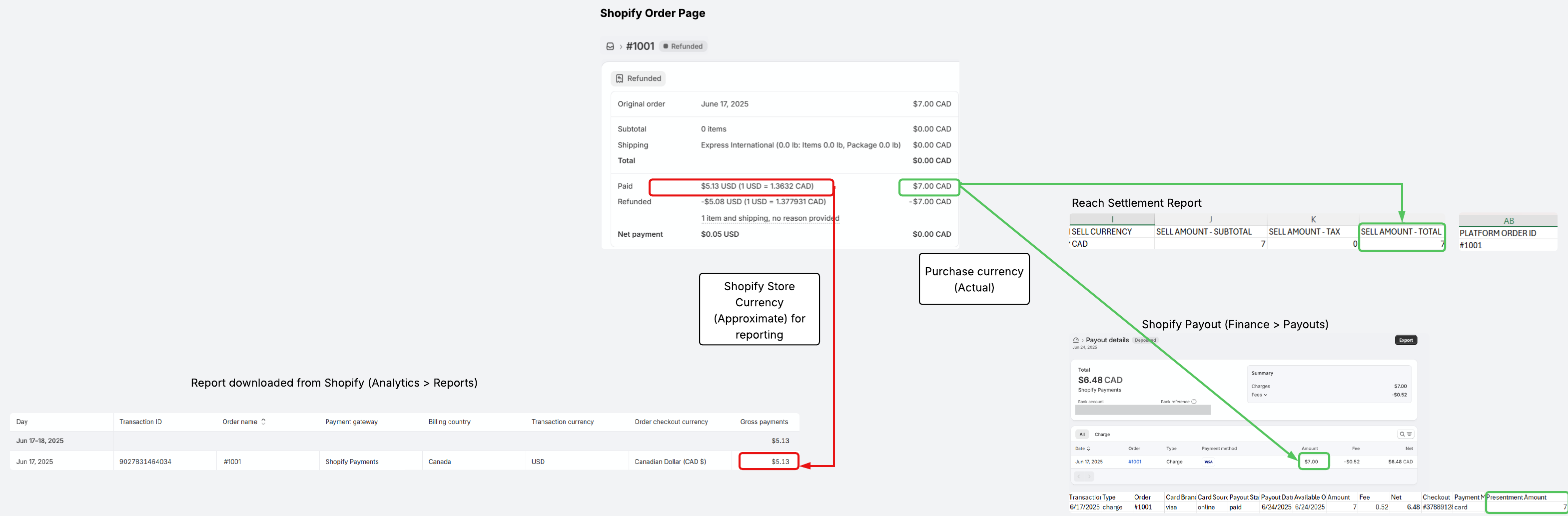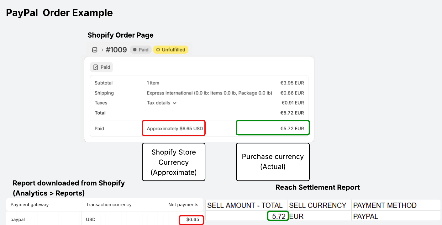 When you examine a Shopify order, its analytics will show an approximate currency conversion, but the Reach settlement report will display the actual purchase currency.