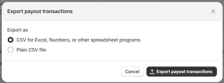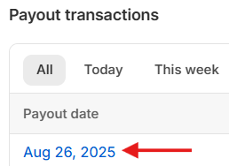 - Download the payout report from Shopify: Navigate to Finance > Payouts in Shopify, filter by the
