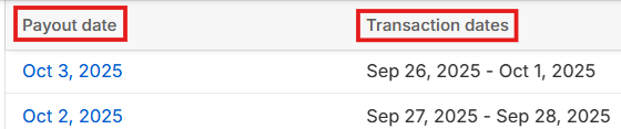 Based on the Shopify payout date (e.g., Oct 3, 2025), the following example uses T+4 as described in the Explanation of the Reach settlement payout. The Reach Start date (2025-10-03) for an order does not match the Date the order was completed (Sep 28, 2025) in the Shopify Payout details report for Oct 3, 2025. It matches the Payout date in Shopify's Payout transaction report. You won't see any order details until Shopify settles with Reach. An order processed in Shopify on Sep 28, 2025, will not appear in Reach until the next Shopify Payout date (Oct 3, 2025).