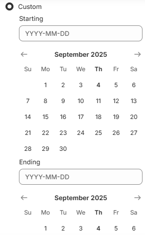 - Click Payout date, select Custom, and enter the first and last PROCESSED DATE in the Starting and Ending fields.