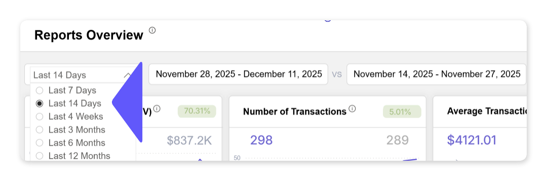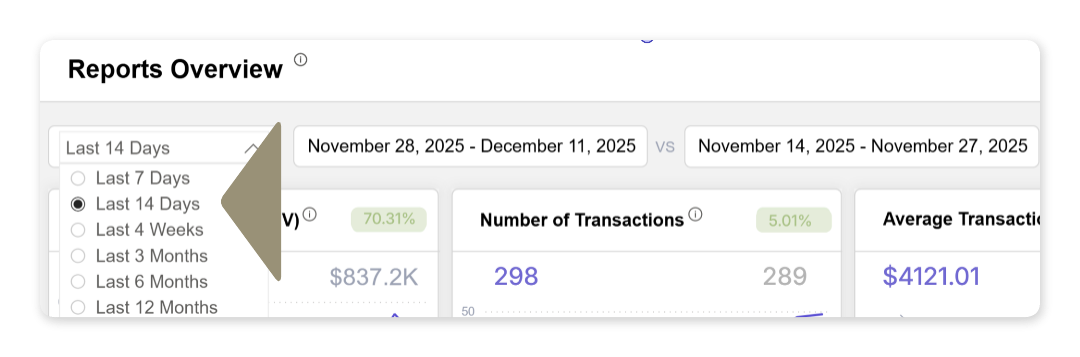 The Reports Overview tab provides a comprehensive view of your business health. Use this sales data to identify trends, monitor growth, and optimize your strategy. The dashboard visualizes essential KPIs, including transaction volume, count, and average value.