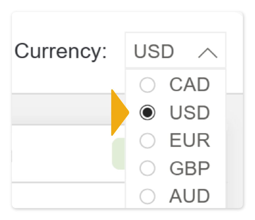 Select a currency from the Currency dropdown on the Dashboards' Chargebacks Overview tab. This list only displays the currencies supported for your store.