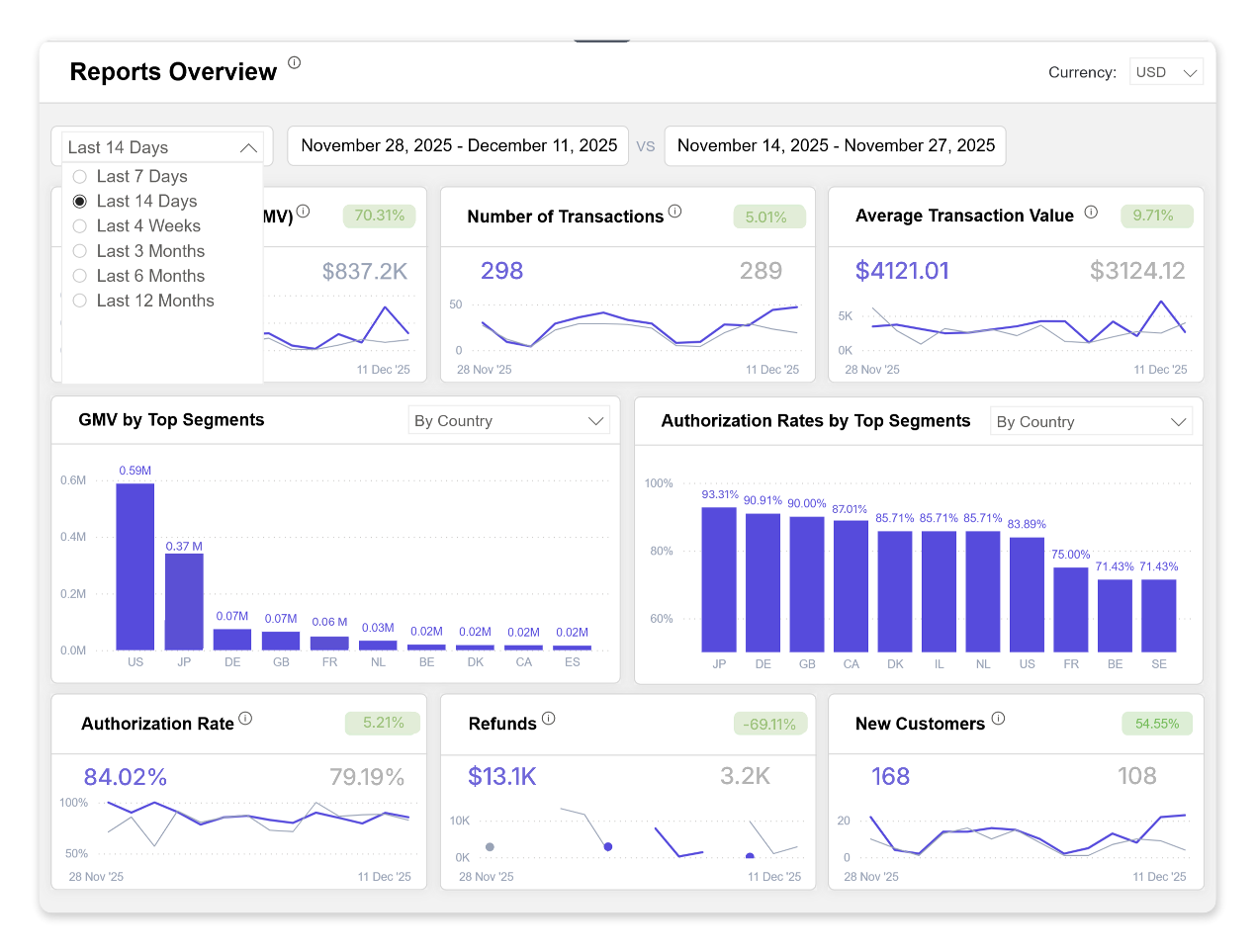 You can also filter by currency and specific timeframes to drill down into the metrics that matter most to your business.