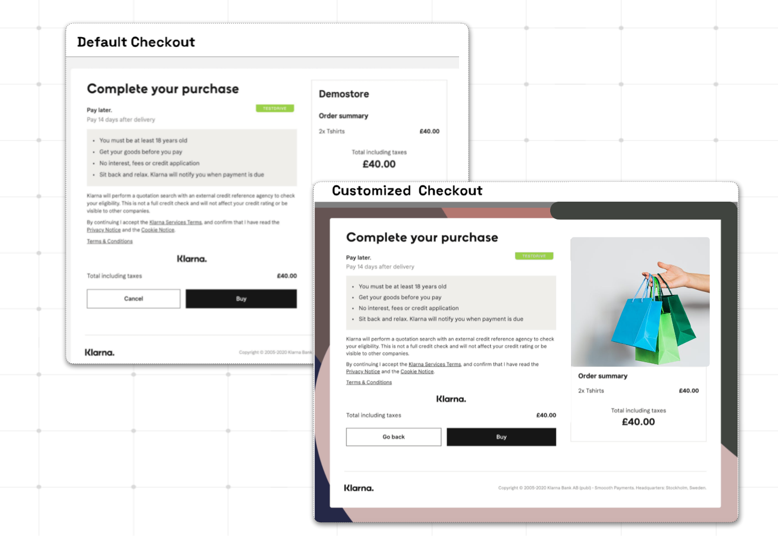 To enhance your customers' Klarna-hosted payment experience, you can provide a feature image or logo that matches your branding. To customize your Klarna checkout, contact the Reach support team with your Klarna custom branding request.