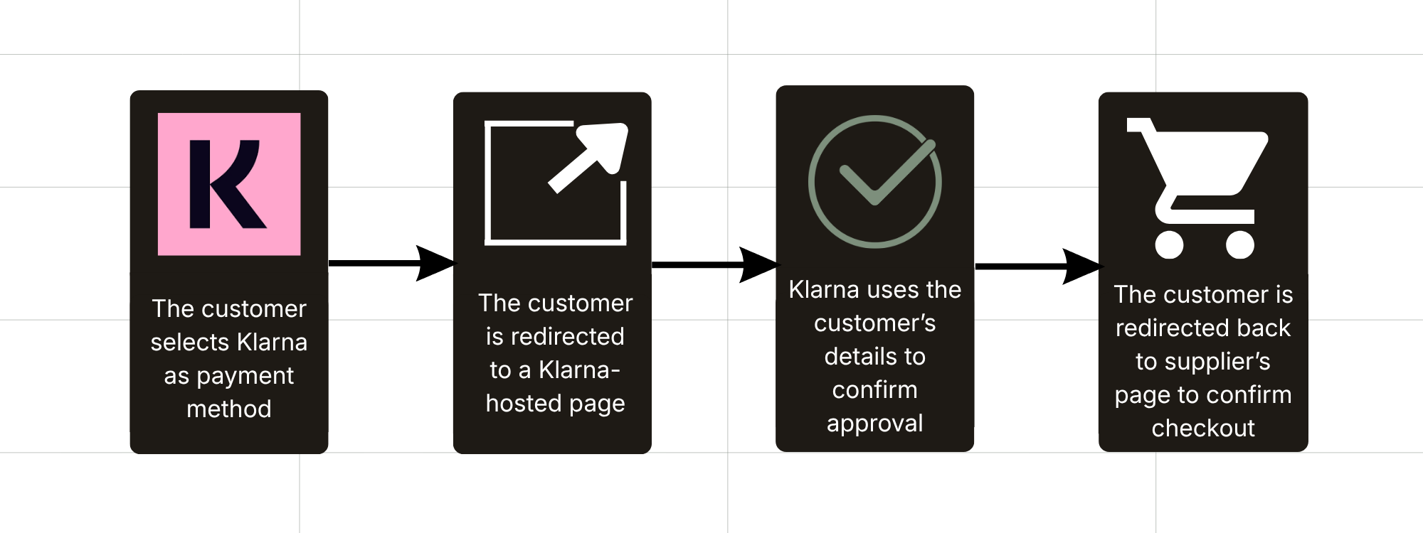 After selecting Klarna as their payment method, the shopper is redirected to a Klarna-hosted page for confirmation. The shopper is redirected to the supplier's site to complete their purchase. Customers can manage their payments through Klarna's app.