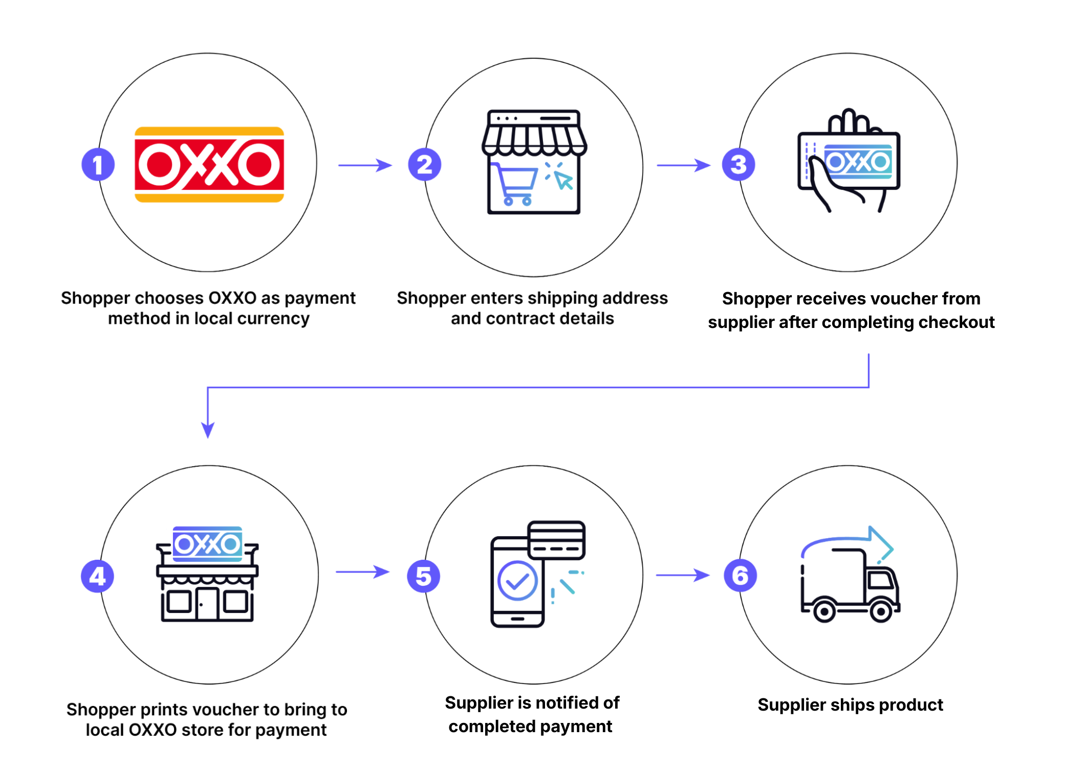 OXXO is a chain of convenient stores that offers alternative cash payments in Mexico. After choosing the OXXO payment method at an online marketplace, shoppers are able to pay at their local OXXO store.