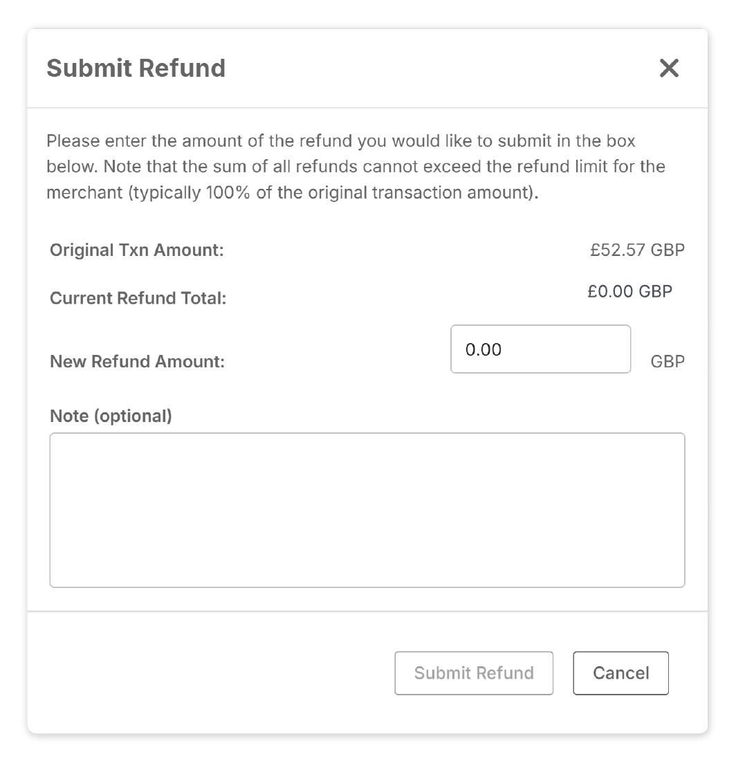 First, use the search tool to filter for the relevant transaction. Click on the transaction row to open the Payment Details windowand navigate to the Refunds tab, then follow the steps below. You can edit refund amounts by following the same process.