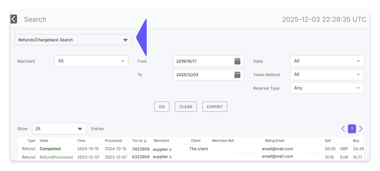 - Select either Transaction Search or Refunds/Chargebacks Search from the top dropdown.
