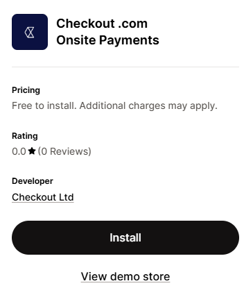 Go to the Checkout.com Onsite Payments App listing on the Shopify app store, then click Install. Shopify will redirect you to the Install app page on your Shopify store. To install the Checkout.com Onsite Payments App, click Install.
