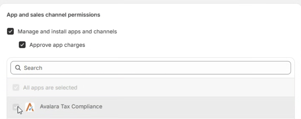 - Under App and sales channel permissions, select the checkbox beside Avalara Tax Compliance.